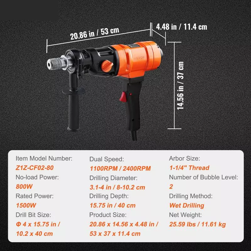 Take your drilling projects to the next level with our 1500W 4-inch Diamond Core Drill Machine. Whether you’re a professional contractor or a DIY enthusiast, this handheld, dual-speed core drill rig makes tackling challenging materials like reinforced concrete, marble, and red brick a breeze. Designed for wet drilling, this compact and lightweight tool is easy to maneuver, even in tight spaces, and provides the power, accuracy, and comfort needed for efficient work.