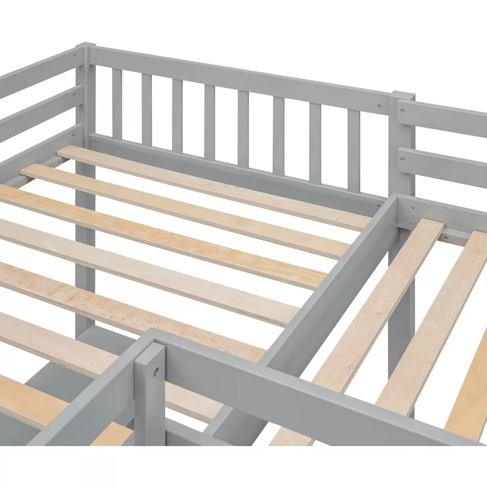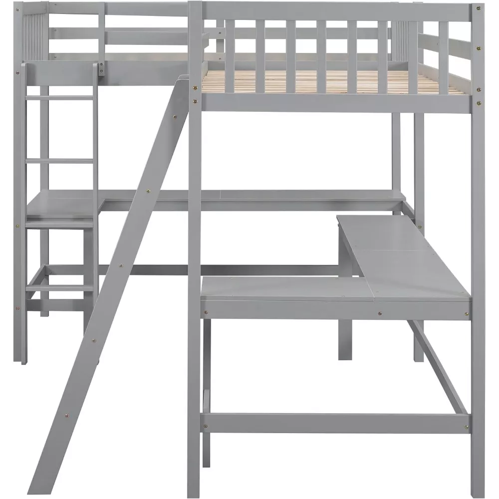 Maximize your room’s potential with our Gray Wood Twin L-Shaped Loft Bed, designed to offer both functionality and style. This innovative loft bed is the perfect solution for those looking to optimize space in a dormitory, shared bedroom, or guest room. With its unique L-shaped design, this bed not only provides two comfortable sleeping areas but also incorporates two built-in desks, making it an ideal choice for students, professionals, or anyone in need of a versatile workspace.