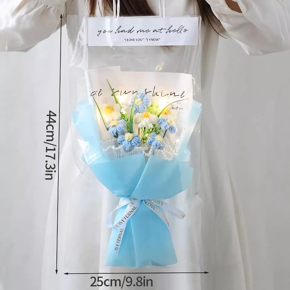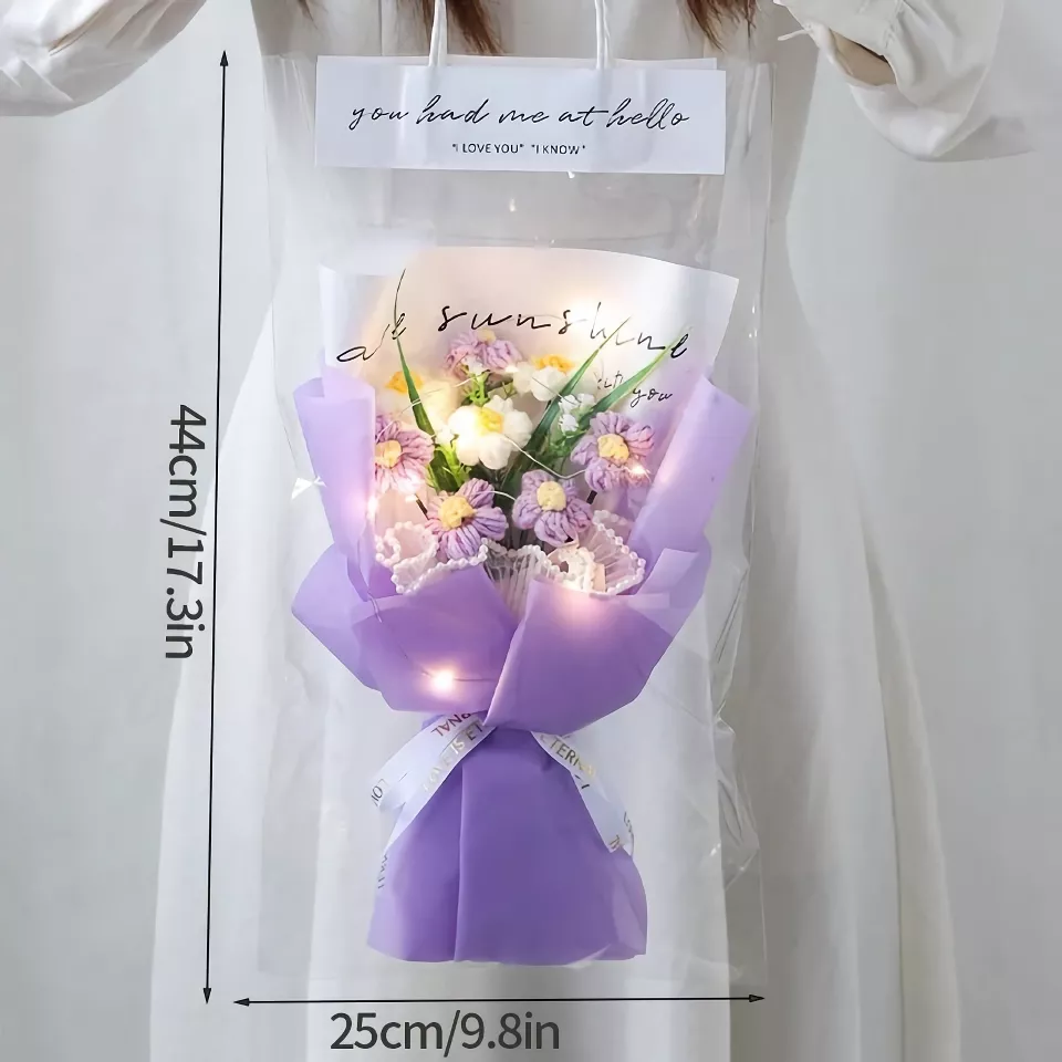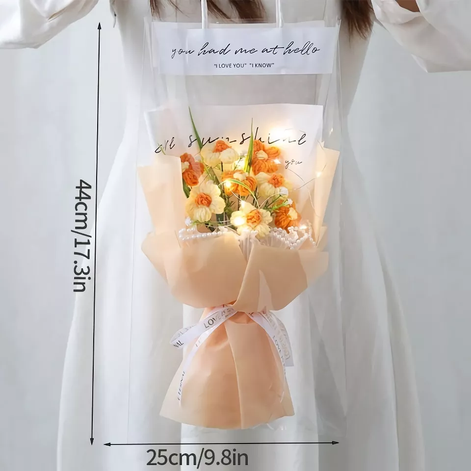 Add a warm and charming touch to your home decor with this exquisite Handmade Crochet Flower Bouquet featuring a soft, glowing LED lamp string. Each puff flower in this bouquet is lovingly crafted from high-quality cotton yarn, creating a timeless and elegant decoration that will never wilt or fade. Perfect for displaying on your coffee table, bookshelf, or bedside, this eternal bouquet combines the beauty of flowers with the cozy ambiance of soft lighting.