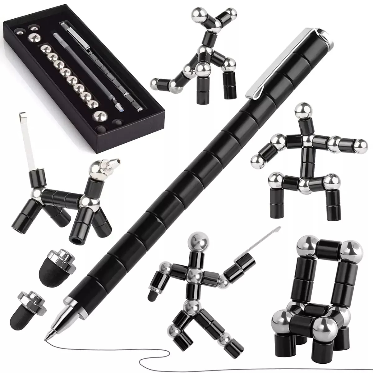 Transform and twist this magnetic pen into countless shapes. Unlike traditional fidget toys, which are limited to one form, the Magnetic Fidget Pen lets you experiment and invent new designs, turning it into swords, robots, or imaginative structures. It’s a tool, a toy, and a unique way to relieve stress, all packaged into one sleek, metallic writing instrument. With its smooth gel pen function and stylus capabilities, it’s perfect for writing notes, creating sketches, and navigating touch screens. You’ll never look at a pen the same way again!