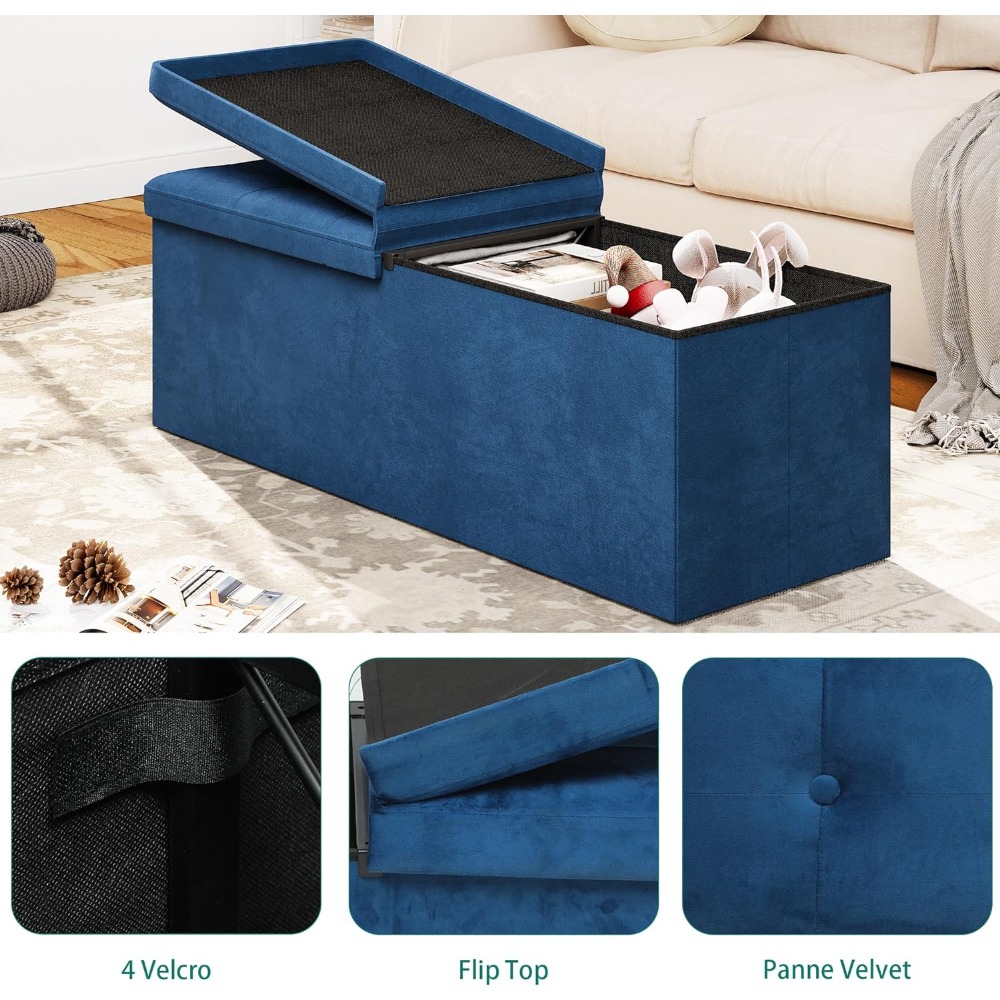 Transform your living space with the 43-Inch Velvet Folding Storage Ottoman Bench with Footrest. This luxurious blue ottoman is not just a beautiful addition to your home, but also a practical solution for storage and seating. Crafted with premium materials, this ottoman bench provides both elegance and functionality, making it an ideal piece for any room.